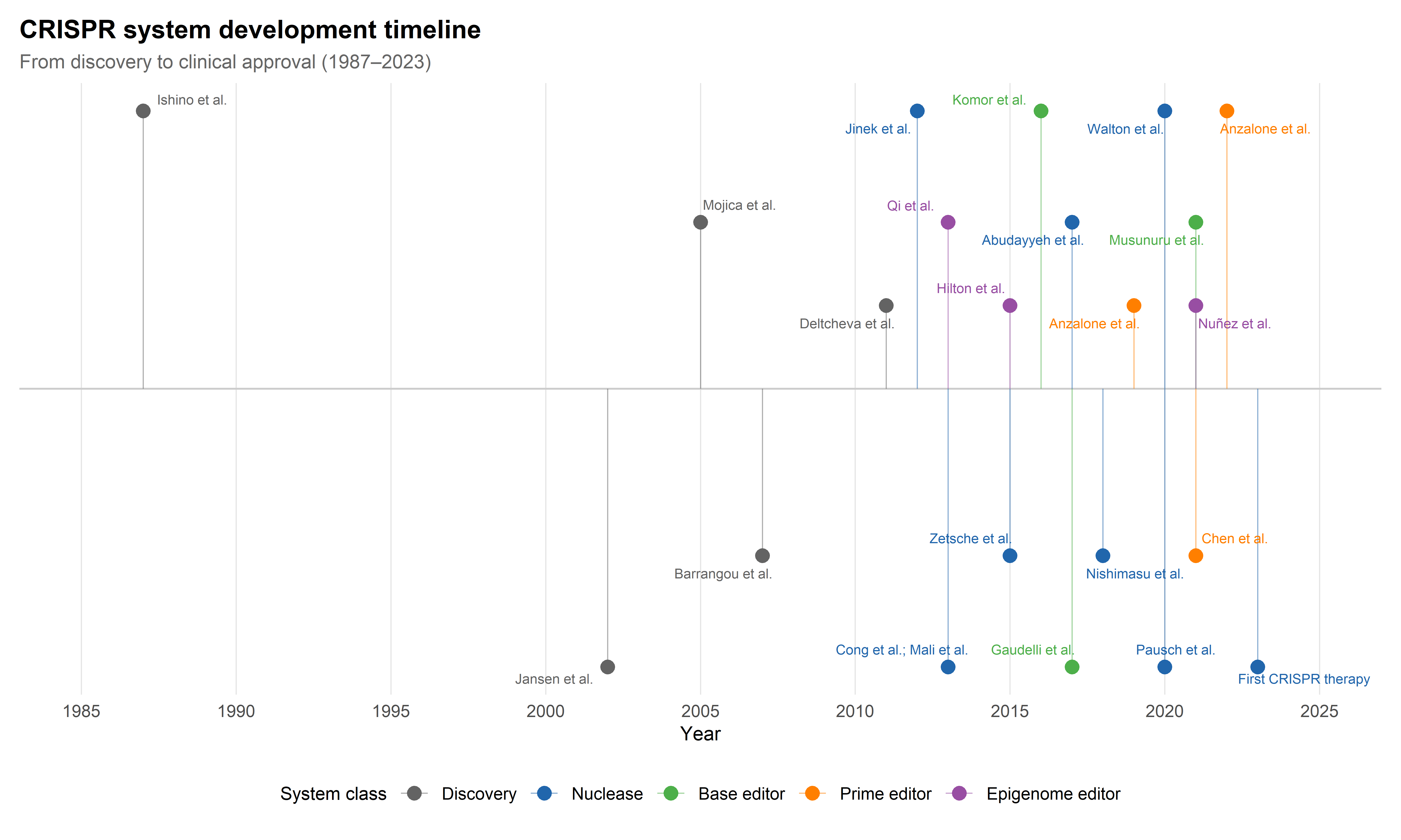 The transformation of CRISPR from an obscure bacterial immune mechanism into the dominant platform for genome engineering constitutes one of the most rapid translations in the history of molecular biology. The acronym — clustered regularly interspaced short palindromic repeats — was formalised by Jansen and colleagues in 2002 (Jansen et al., 2002), but the underlying repeat structures had been observed as early as 1987 in Escherichia coli (Ishino et al., 1987). The biological function of these arrays as an adaptive immune system against phage infection was proposed by Mojica and collaborators in 2005 (Mojica et al., 2005) and experimentally confirmed by Barrangou et al. in 2007 (Barrangou et al., 2007). The decisive conceptual leap came with the demonstration by Jinek et al. in 2012 that the Cas9 protein from Streptococcus pyogenes, guided by a dual RNA structure that could be simplified into a single guide RNA (sgRNA), was capable of programmable DNA cleavage in vitro (Jinek et al., 2012). Within months, three groups independently demonstrated that this system could be repurposed for genome editing in human cells (Cho et al., 2013; Cong et al., 2013; Mali et al., 2013), launching a technological trajectory that has since yielded an entire family of editing tools, each addressing specific limitations of the original system.