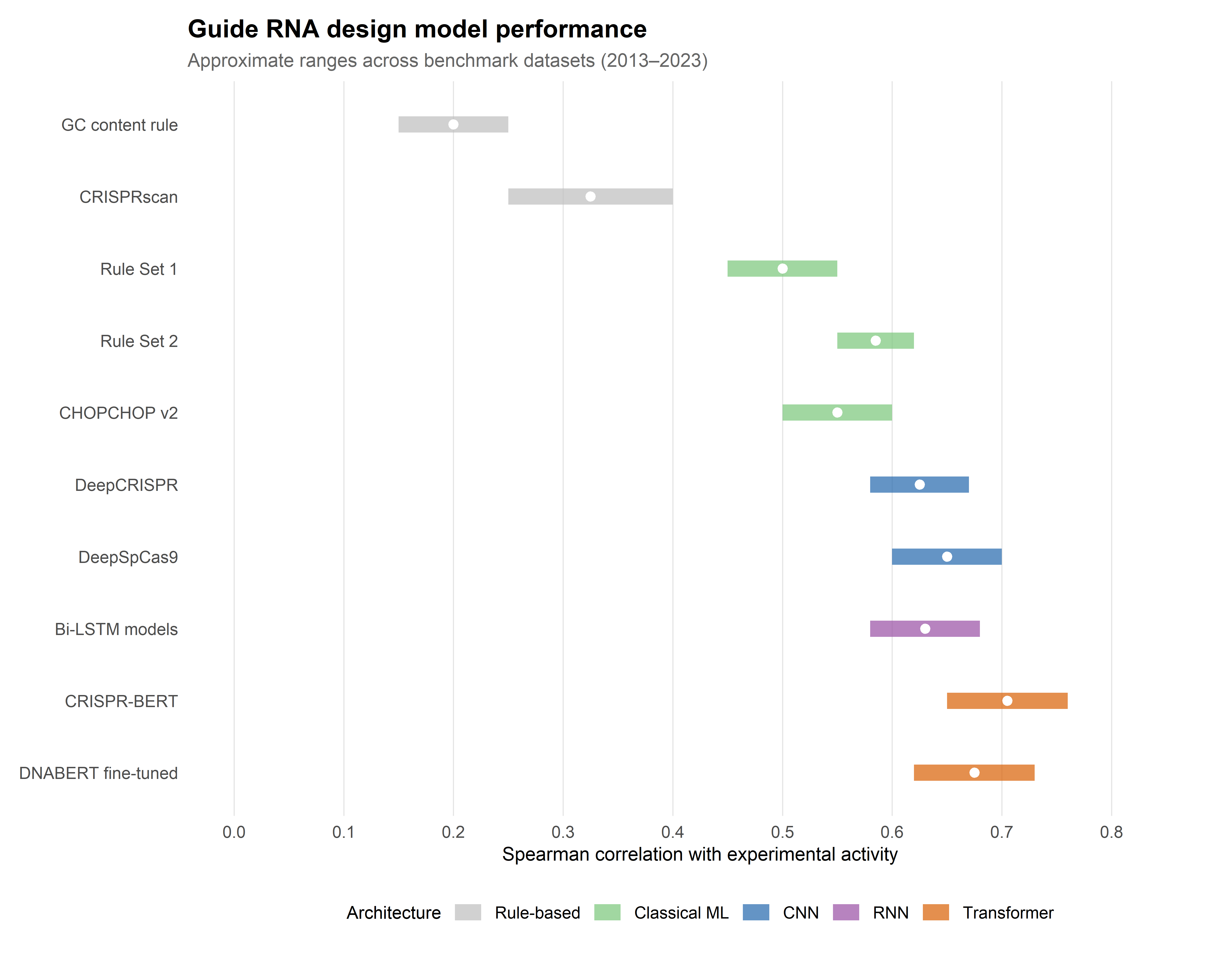 Figure 2.2: Approximate performance of guide RNA design models across benchmark datasets, measured by Spearman correlation with experimental on-target activity. Bars show ranges reported across multiple independent evaluations. Models are grouped by architecture class. Performance varies substantially with dataset, cell type, and evaluation protocol; values should be interpreted as indicative rather than definitive.