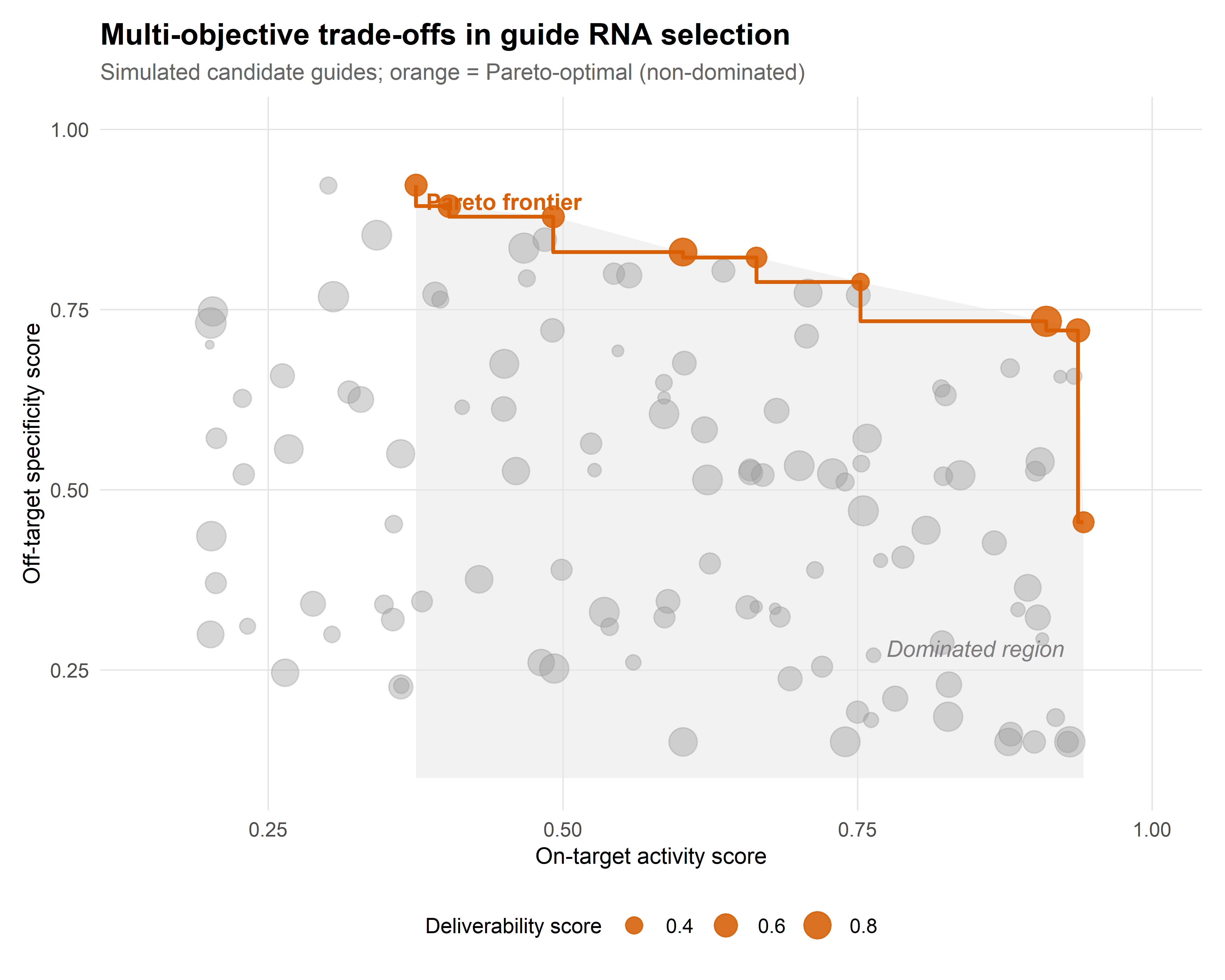 Figure 2.1: Schematic illustration of the multi-objective trade-off in guide RNA selection. Each point represents a candidate gRNA scored on on-target activity (x-axis) and off-target specificity (y-axis); point size encodes a third objective, deliverability. Orange points along the Pareto frontier are non-dominated candidates — no other guide scores higher on both axes simultaneously. The shaded region below the frontier contains dominated guides. Arrows indicate the direction of improvement on each axis. In practice, experimenters select from the frontier according to application-specific priorities: a therapeutic programme may weight specificity heavily, whilst a high-throughput screen may prioritise activity.